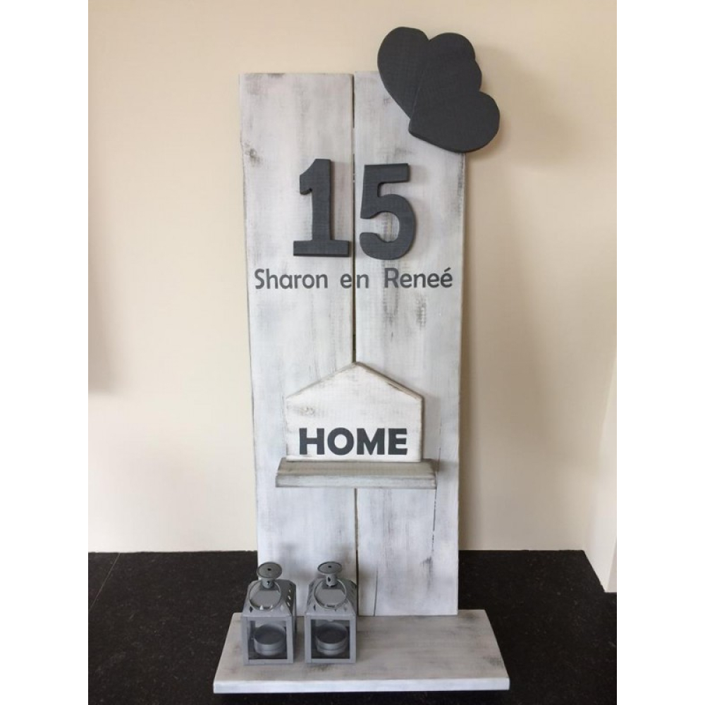 Een groot wandbord gemaakt van steigerhout, met je naam en huisnummer erop.