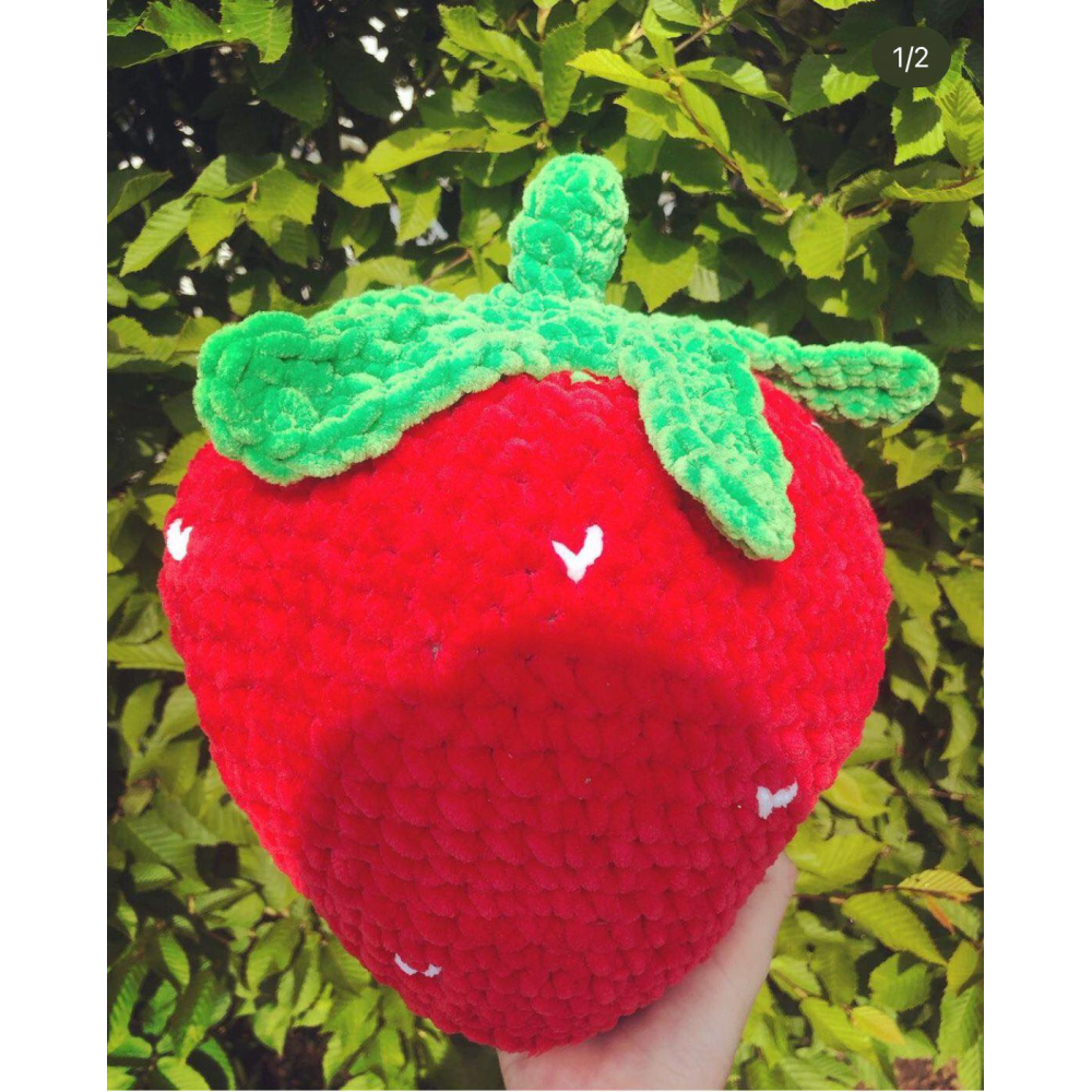 Een hele mooie gehaakte aarbei van maar liefst 30 x 23 cm.