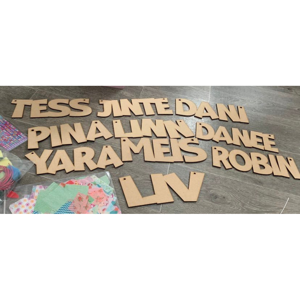 * Namen van hout, lijm, papier, verf, stickers diamantjes en je eigen naam op sticker.