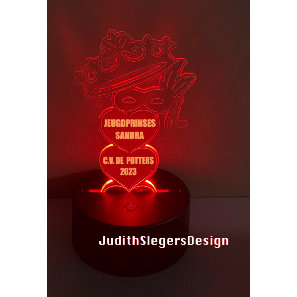 Led-lampje (plexiglas) op houder, met persoonlijke tekst erop.