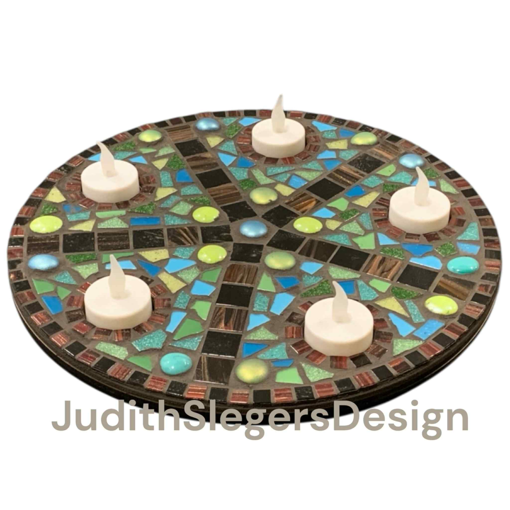 Dit mooie plateau voor 5 theelichtjes heeft een doorsnede van 30 cm.