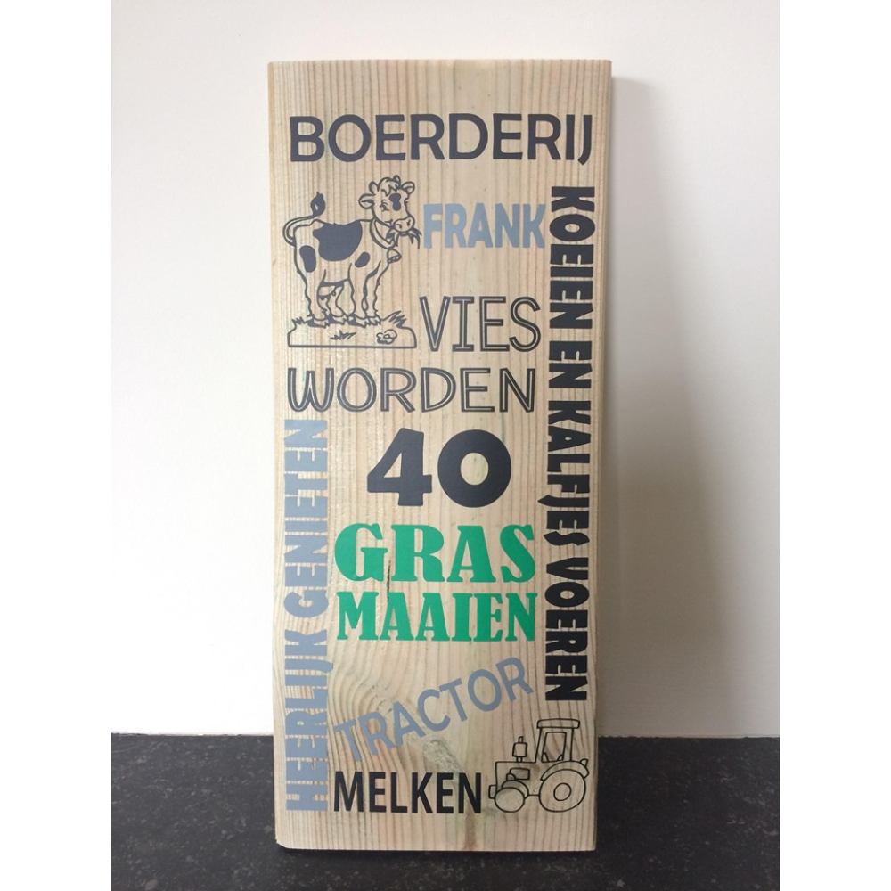 Een persoonlijke steigerhoutbordje met je eigen woorden en afbeeldingen erop.